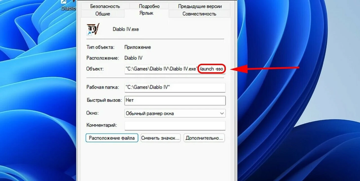 Закройте Diablo 4, снова кликните по ярлыку правой кнопкой мыши, откройте «Свойства» и «Ярлык». В разделе «Объект» допишите -sso. Должно получиться «C:\Games\Diablo IV\Diablo IV.exe» -launch -sso