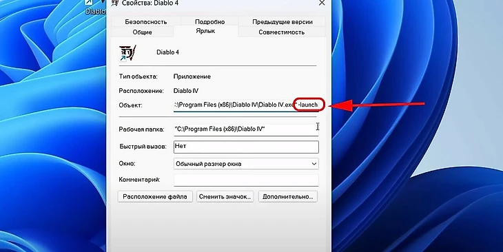 Кликните на ярлыке с рабочего стола правой кнопкой мыши, откройте «Свойства» и перейдите во вкладку «Ярлык». В разделе «Объект» допишите -launch. Должно получиться «C:\Games\Diablo IV\Diablo IV.exe» -launch