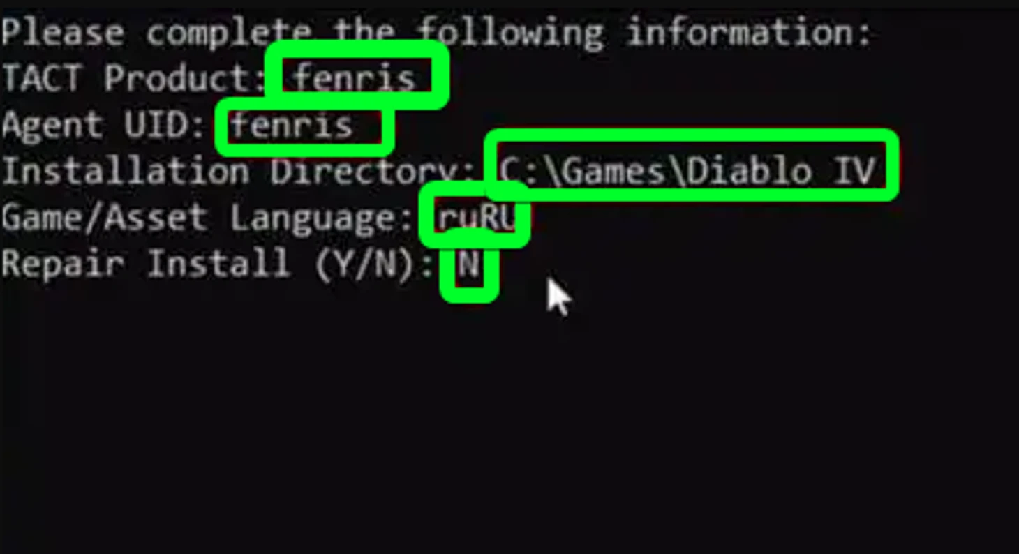 Запустите Battle.Net Installer, откроется консоль. Последовательно введите в нее следующую информацию: fenris, fenris, [путь до любой папки в которую нужно установить игру], ruRU, N