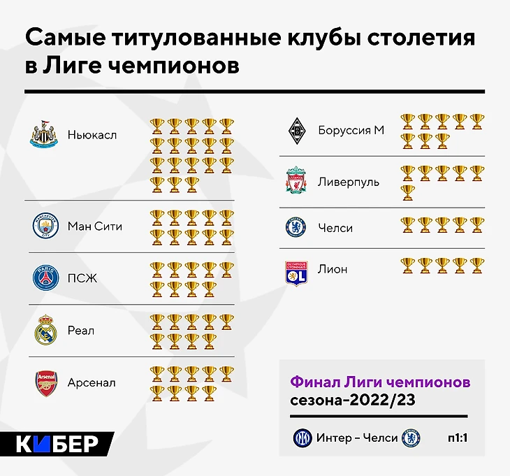 FM поставил в ЛЧ на «Интер». «Ман Сити» выиграл кубок 10 раз, а рекорд у «Ньюкасла»