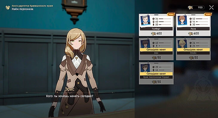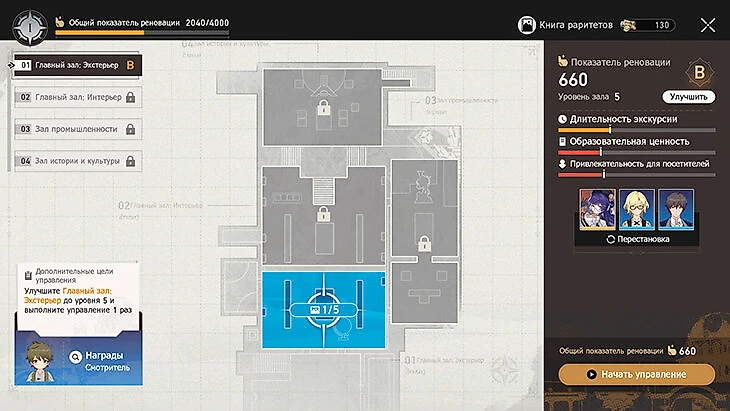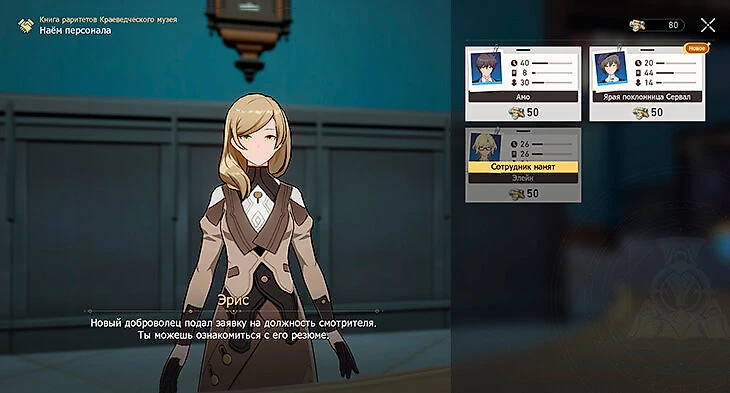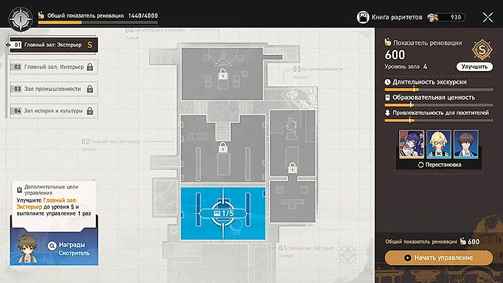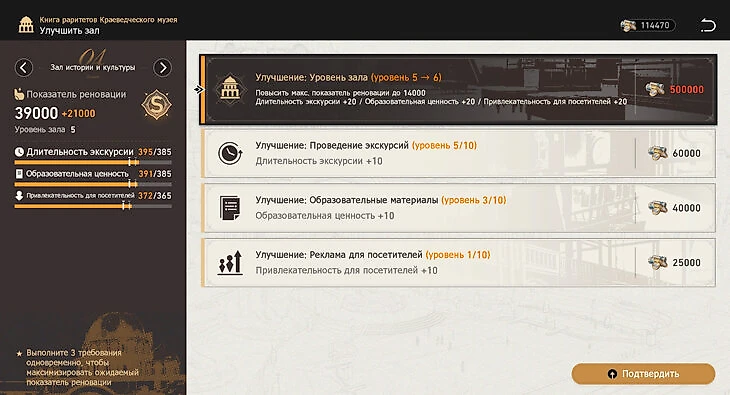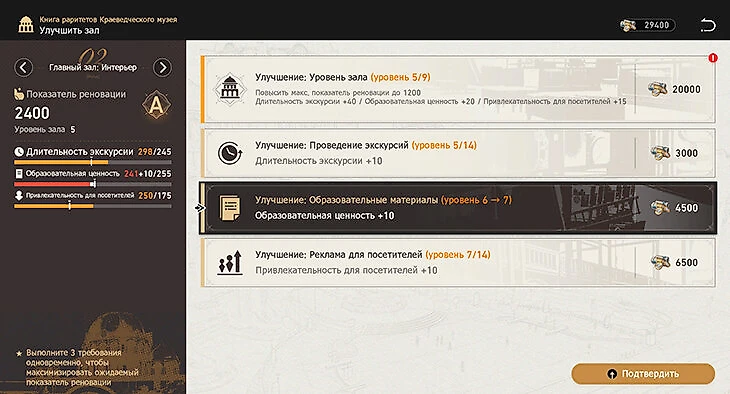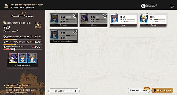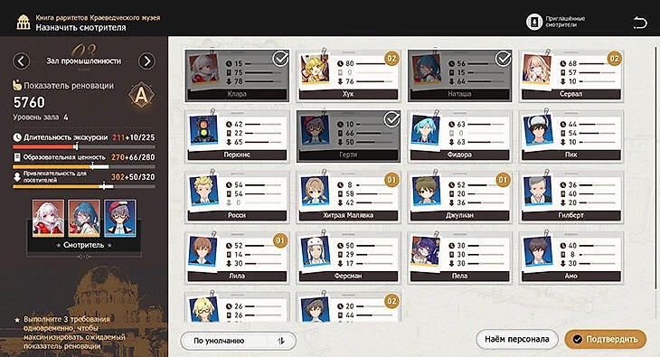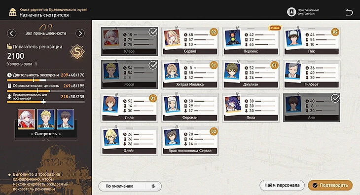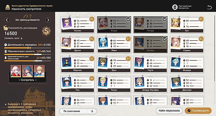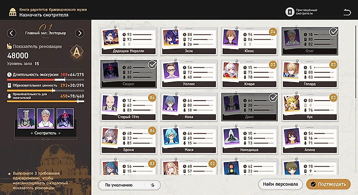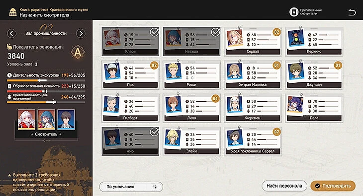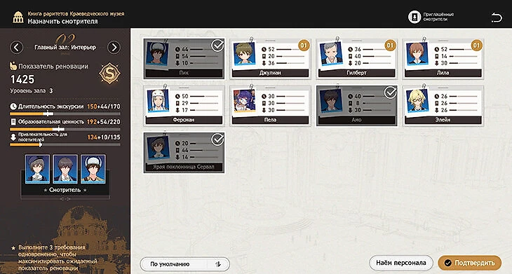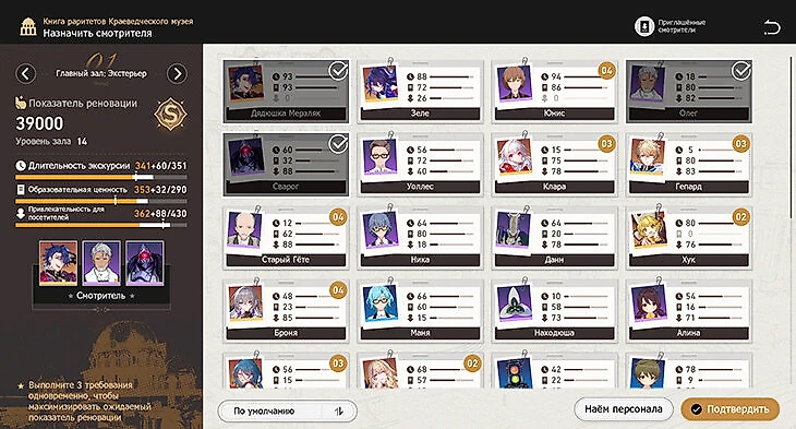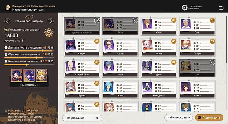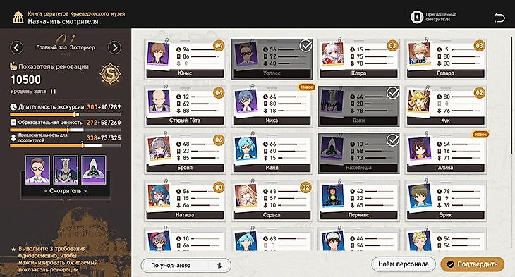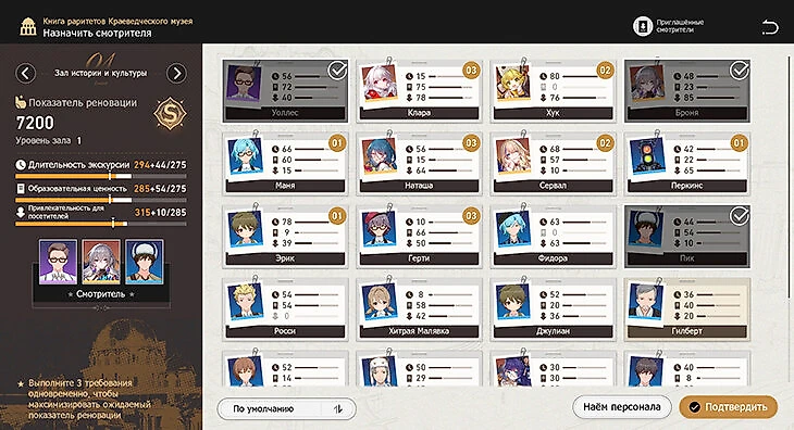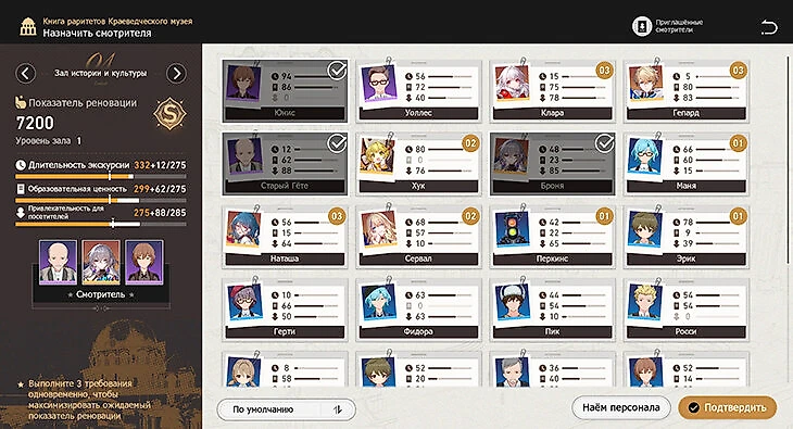 Следующая миссия – улучшение зала истории и культуры до 3 уровня. Можно нанять новых смотрителей – Юнис и Старого Гете, чтобы показатели взлетели вверх. Останется только накопить деньги заново на прокачку уровня.