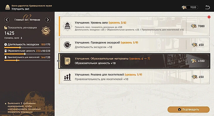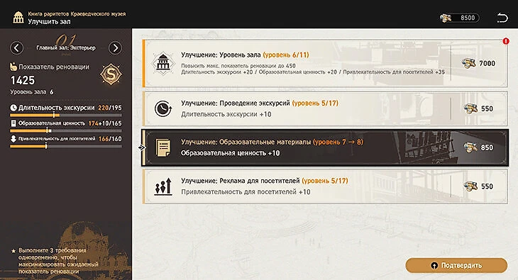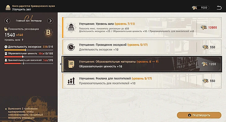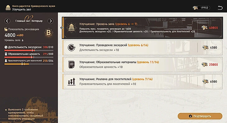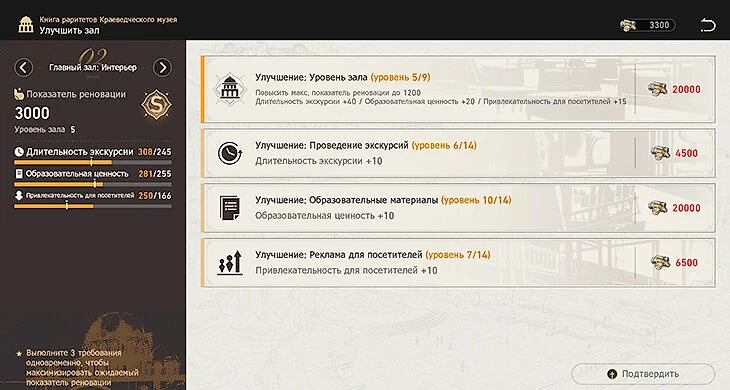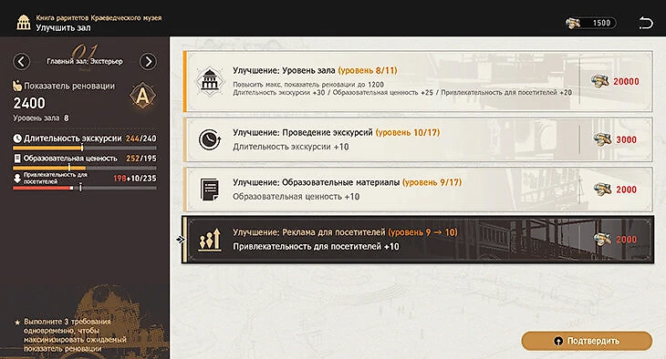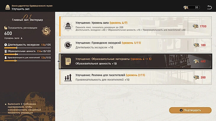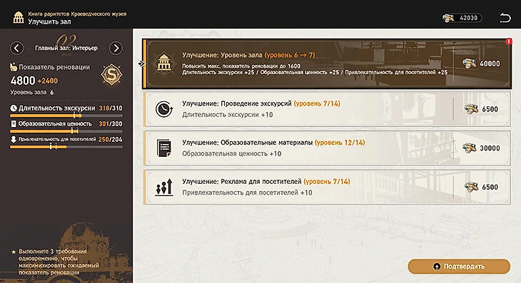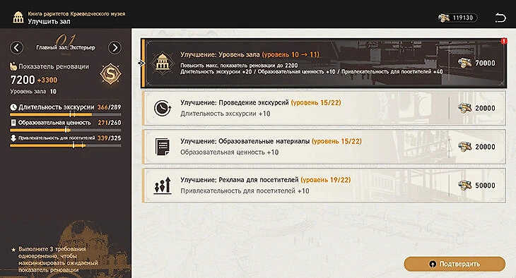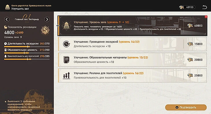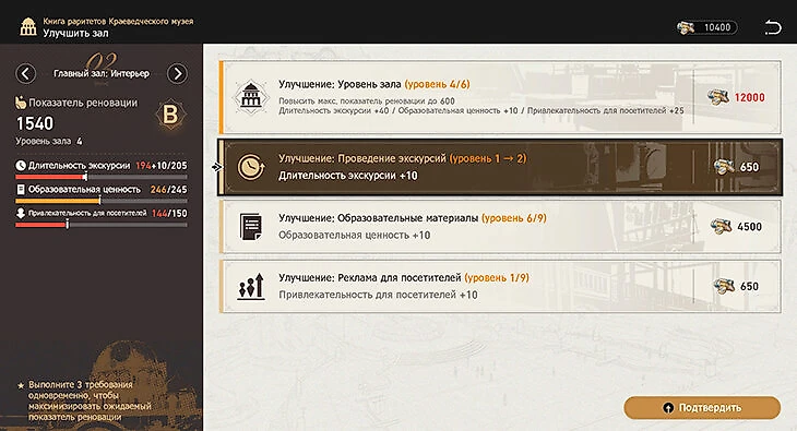 После этого можно возвращаться к Эрис и начинать 10 день управления музеем. Пока в экстерьере все хорошо, нужно заняться интерьером и улучшить его до 4 уровня. Но не стоит сразу рваться на 4 уровень, чтобы не разориться, достаточно прокачать до 3 и добрать улучшений образовательной ценности. Таким образом оба зала поддержат отметку S, и мы оставим деньги на будущее.