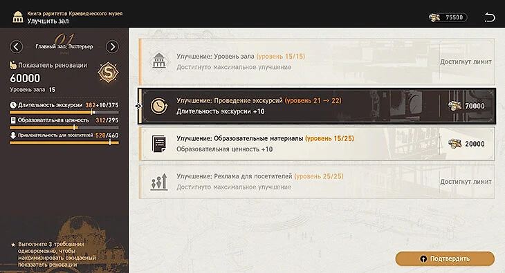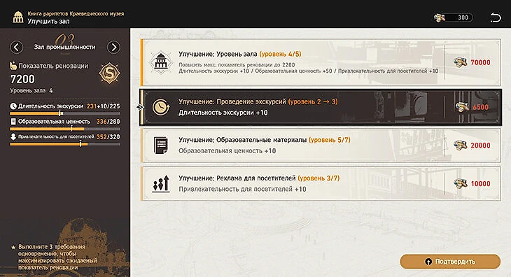 Нужно сбалансированно прокачивать все аспекты. Например, можно прокачать в меню улучшений зала образовательные материалы и рекламу/проведение экскурсий и нанять Амо, чтобы он закрыл потребность в первом и третьем пунктах. Если вы прокачаете экскурсии и рекламу, стоит нанять ярую поклонницу Сервал, чтобы она закрывала нехватку образовательных материалов.