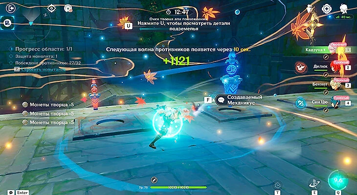 Враги: лавачурл с инеевым панцирем, митачурлы с ледяным щитом, огненным топором и Электро топором, различные хиличурлы. Нужно набрать 315 очков творца за 15 минут. В дырах полу можно создать механикусов и повышать их уровни за очки творца.