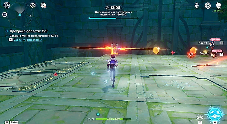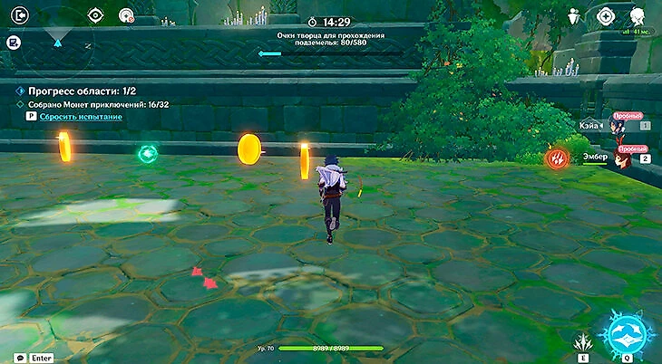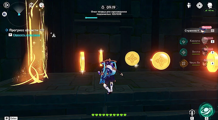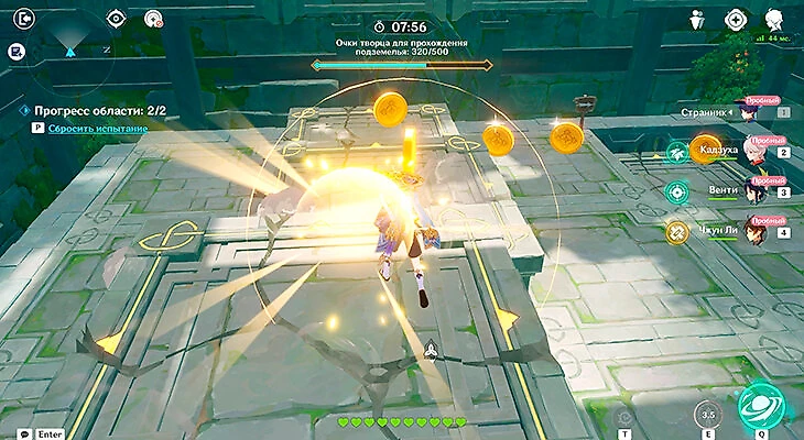 На этом этапе нужно собрать все монеты на поле. В первой части придется уклоняться от хиличурлов. По комнате разбросаны баффы на высокий прыжок, бонус скорости передвижения, а ближе к концу сбора будет на восстановление здоровья. Драться не имеет смысла, можно просто убегать, пока шкала монет не заполнится.