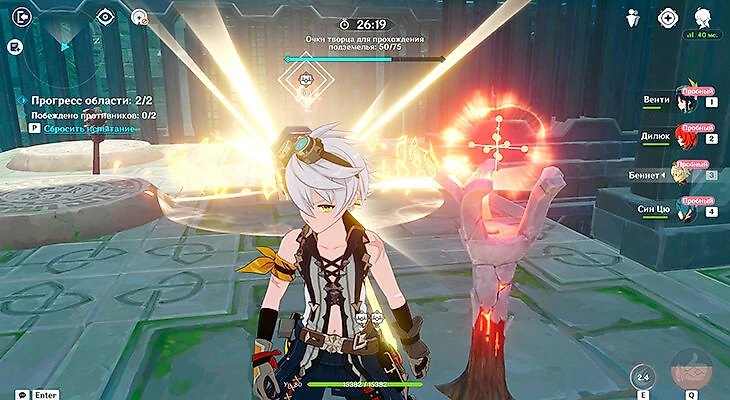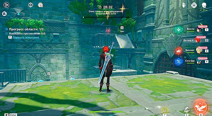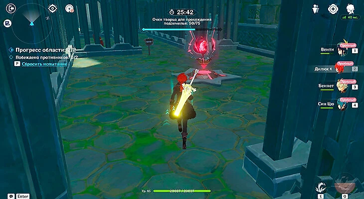 Это подземелье наполнено загадками, которые нужно решить, чтобы уничтожить усилители врагов. Они быстрее всего уничтожаются персонажами с двуручным мечом. В списке врагов тоже Гео слаймы со щитами и лавачурлы, которым тоже проще всего снять щиты двуручником. Возьмите в качестве главного дамагера Дилюка (его заряженные атаки быстрее, чем у остальных), Кавеха, Эолу, Чун Юня, Рэйзора, либо Дэхью вспомогательным дпс. Также можно взять Ноэлль для щита или Дори для хила. Обязательно взять одного Пиро персонажа на любую позицию для решения загадок.