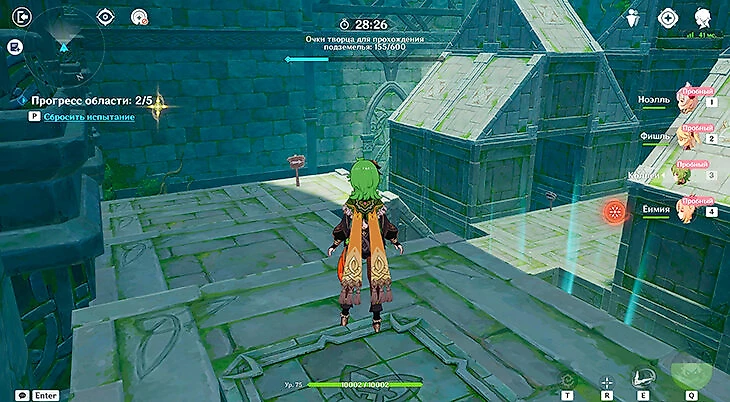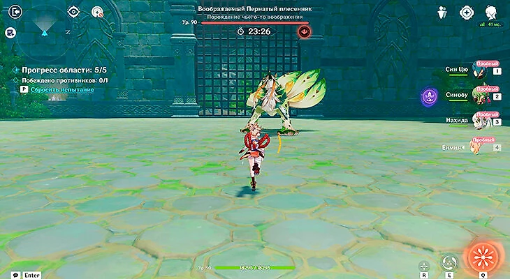 В этом подземелье пять этапов с противниками и испытаниями. Врагами будут босс пернатый плесенник, лавачурл, кайраги огненная мощь и громовое вознесение, элитные пустынники, а также хиличурлы, митачурлы и нобуси. Всего доступно 3 героя, но в подземелье есть места призыва, где можно призывать персонажей, а также точки для усиления.