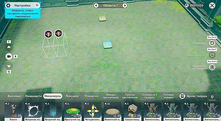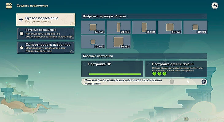 Для создания своего подземелья нужно зайти в меню особых событий, выбрать «Подземелья игроков» и перейти на вкладку «Создать» вверху по центру экрана. Там появятся пустые слоты, выберите любой и войдите в творческий режим. На выбор дается 7 областей различного размера, берите подходящую для вашего будущего испытания – если это сражение с монстрами, то можно взять небольшой квадрат, а для создания испытания на время с воздушными потоками можно взять длинный прямоугольник или большой квадрат 80 на 80. Можно создать подземелье из нескольких областей с помощью кнопки +, но надо расставить телепорты от локации к локации.