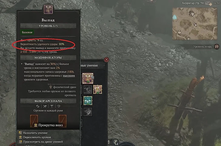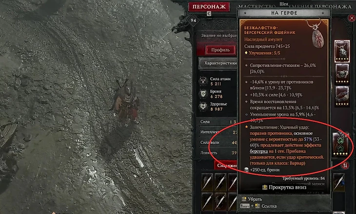 Однажды варвар найдет экипировку или аспект, завязанные на удачном ударе. На скрине амулет с аспектом, который при удачном ударе с вероятностью до 60% продлит эффект берсерка. Если атакуете «Вихрем», берите эти 60% и умножайте на 0.2 (то есть 20% от «Вихря») – получите 12%. Именно с этой вероятностью сочетание «Вихря» и амулета продлит эффект берсерка.