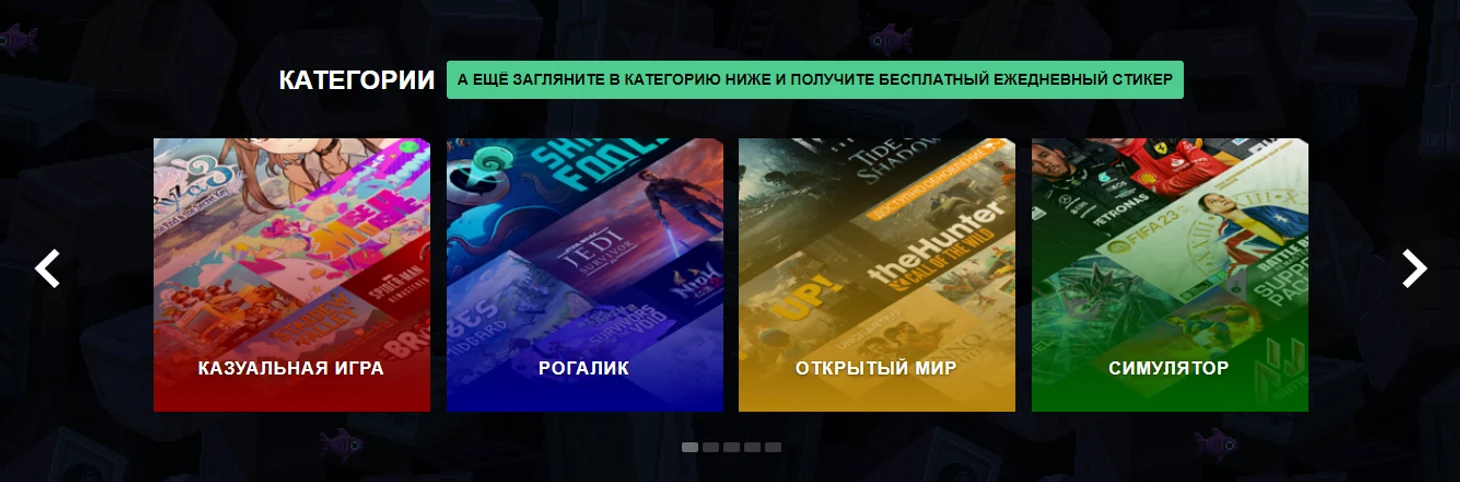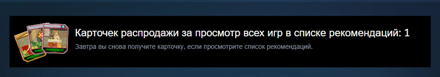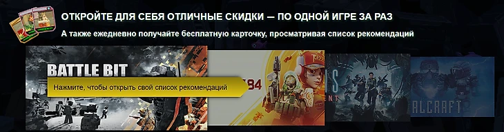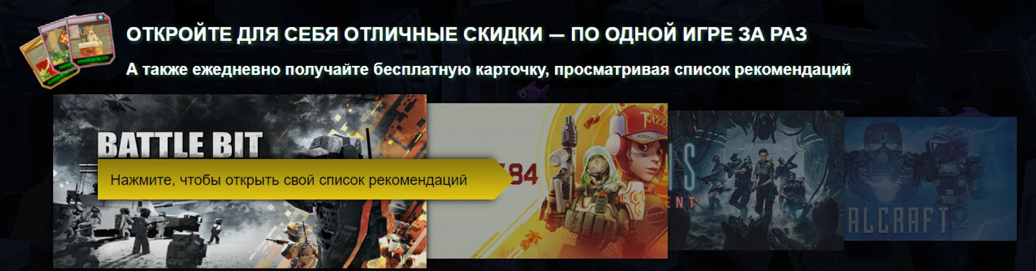 Найдите блок «Откройте для себя отличные скидки – по одной игре за раз. А также ежедневно получайте бесплатную карточку, просматривая список рекомендаций»