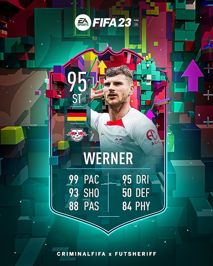 Тимо Вернер уже имеет несколько специальных карточек в FUT 23, включая версию «Дорога к чемпионату мира» и предмет «День рождения FUT». Хотя точные характеристики его карты не были раскрыты, FUT Sheriff предполагает, что он может получить вариант с 95 рейтингом и такими статистическими данными: