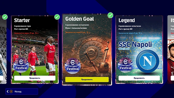 Отдельно выделим редкий турнир «Золотой гол». Его играют самостоятельно, зато матчи сами останавливаются после первого гола и сильно сокращают время на прокачку игроков. Не злоупотребляйте лазейкой во избежание возможных санкций от Konami, но несколько десятков матчей за событие вам точно не навредят.