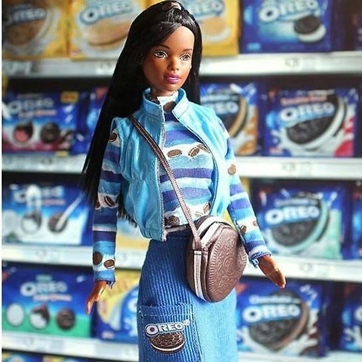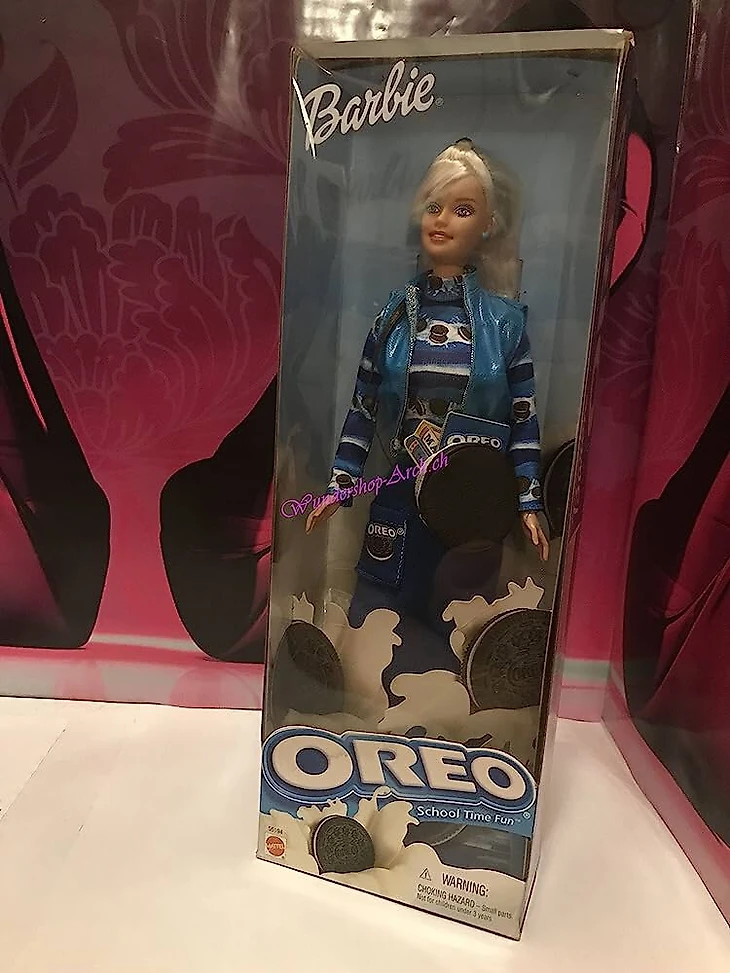 В 1997 году Mattel заколлабилась с производителем печенья и снэков Nabisco, которые известны благодаря печенью Oreo. Тогда вышла светлокожая блондинка Барби в длинной синей юбке, жилетке и водолазке в цветах упаковки «Орео». У куклы были неплохие продажи, поэтому спустя 4 года в рамках этого же коллаба Mattel выпустила темнокожую куклу и получила лишь критику.