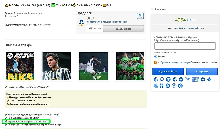 Купить гифт EA Sports FC 24 на маркетплейсах посредников с возможностью активации на российском Steam