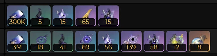 Навык/сверхспособность/талант: 9 инстинктов вора, 13 искаженных амбиций, 7 воли завоевателя, 9 обсидианов ужаса, 13 обсидианов запустения, 7 обсидианов одержимости, 2 отпечатка судьбы, 3 покаяния вечного ложного тела, 652 500 кредитов.