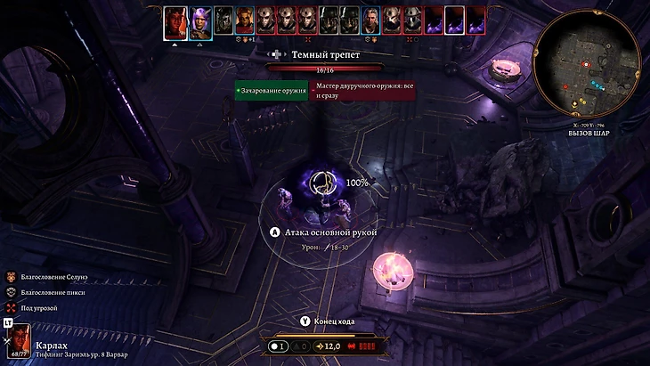 В идеале атакуйте копии других героев, иначе получите дебаф. Если ходит Карлах, бейте кого угодно, но не злую Карлах. После победы получите второй самоцвет.