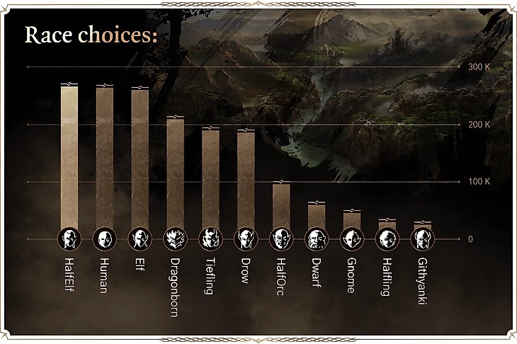 Самая популярная раса – полуэльфы, также в тройке люди и эльфы. Реже всего выбирали гитьянок;