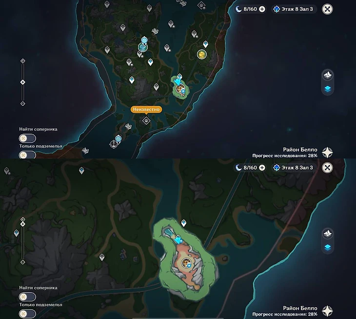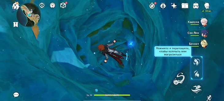 Заплывайте в воду и нажмите кнопку «Нырнуть» – она появится в меню. Проплывите чуть дальше, пока не увидите подводную пещеру, и ныряйте еще глубже.