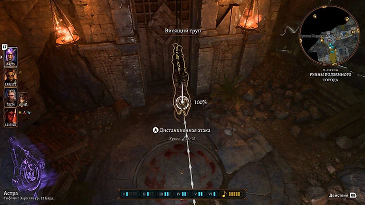 Ударьте героя в круге или выстрелите в подвешенный к потолку труп.