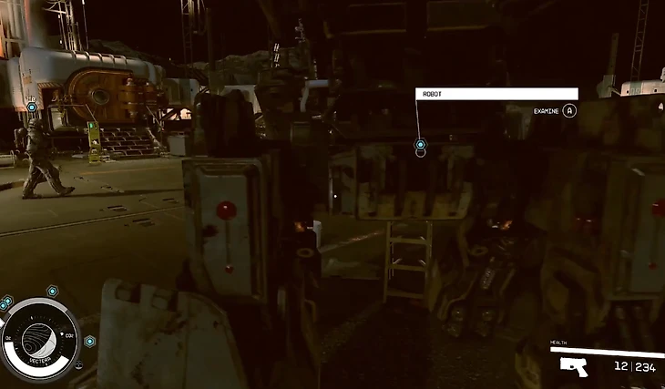 За пределами комплекса мы видим три синих маркера и следуем от одного к другому. У этого робота есть энергетическая ячейка: