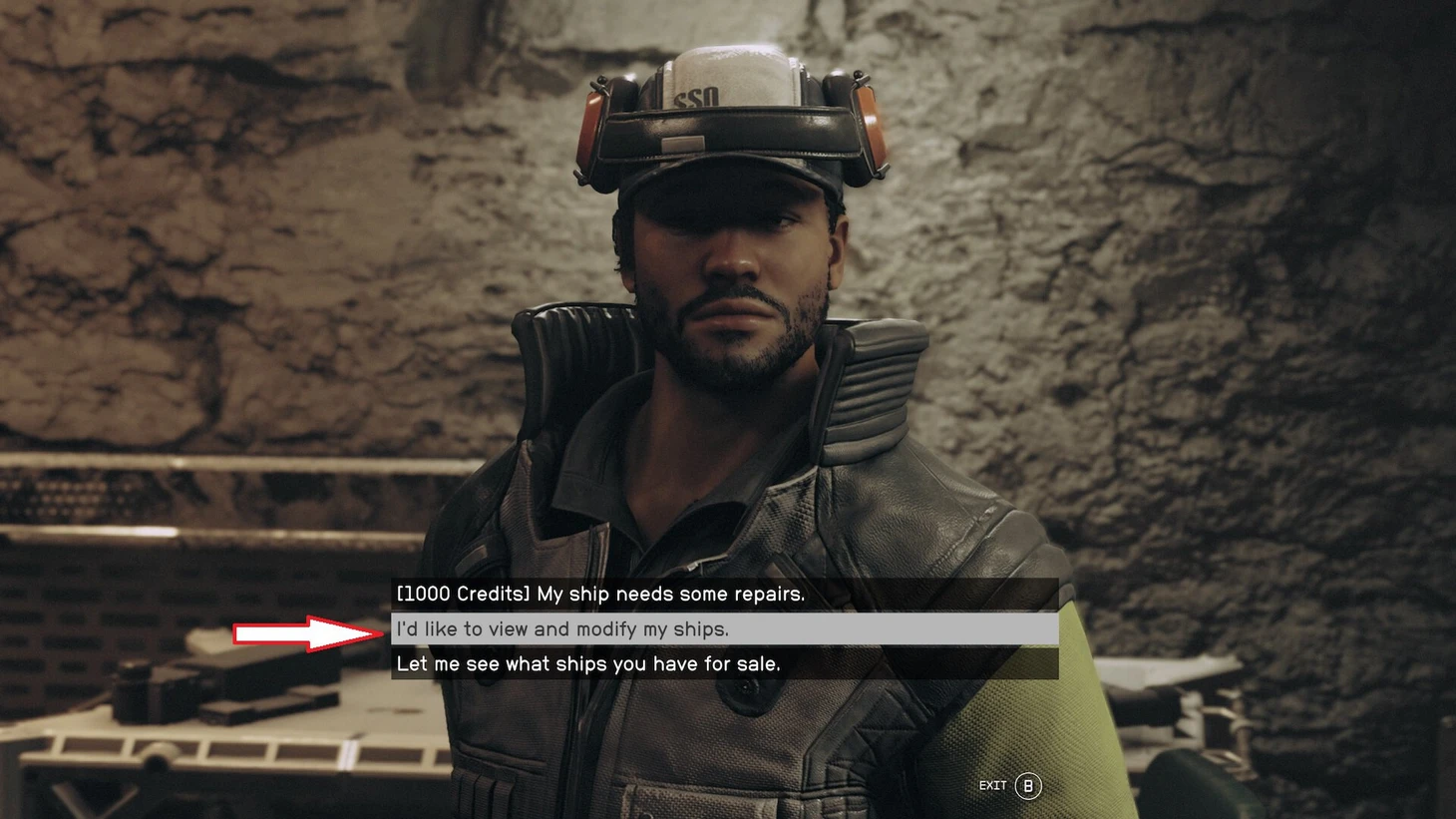 Поговорите со специалистом по кораблям и выберите фразу «I’d like to view and modify my ships».