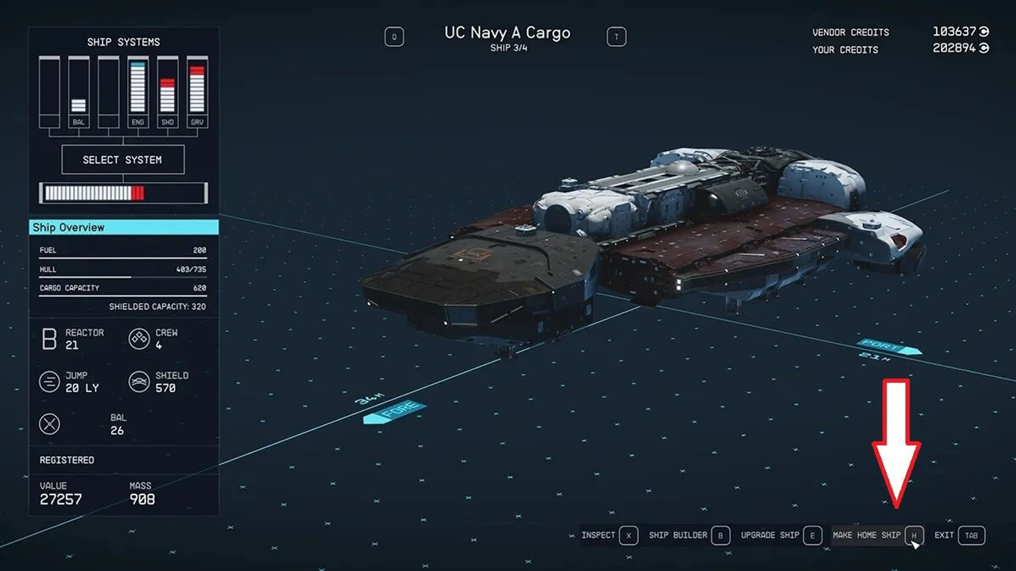Идите к торговцу и откройте меню по улучшению своих кораблей. Выберите там подходящее судно и нажмите «Make home ship» (H на ПК).