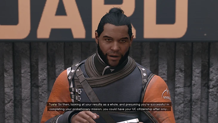 Командир оценит ваши успехи, включая возможное знакомство с историей UC в Orientation Hall. Он похвалит вас за определенные вещи и сразу обозначит, через сколько лет вы сможете получить гражданство. Цифра зависит от ваших навыков пилотирования: справились лишь с 3 волнами – придется ждать 10 лет, сумели победить вообще всех – получите всего через 3 года. Но последущее прохождение показало, что Туале не стоит доверять в этом вопросе. Если вы пройдете цепочку квестов авангарда, UC не будет ждать 10 лет и сразу гордо сделает вас гражданином.