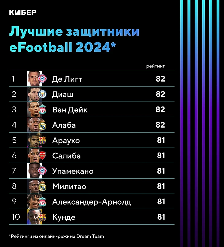 Квартет лучших защитников eFootball 2024 составили Маттейс де Лигт, Рубен Диаш, Вирджил ван Дейк и Давид Алаба (все – по 82), но самым дорогим оказался именно нидерландец из «Баварии» – G 260 тысяч. Лучшие крайние защитники игры – Трент Александер-Арнолд и Жоау Канселу (оба – по 81), причем португалец свободно играет на обоих флангах.