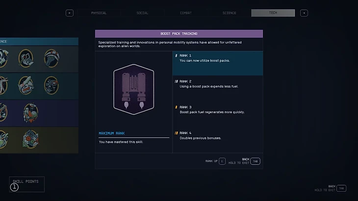 Прокачка джетпака происходит так же, как улучшение других навыков в Starfield: через меню навыков. Заходите туда же, где разблокировали реактивный ранец, и вливайте очки в способность Boost Pack Training.