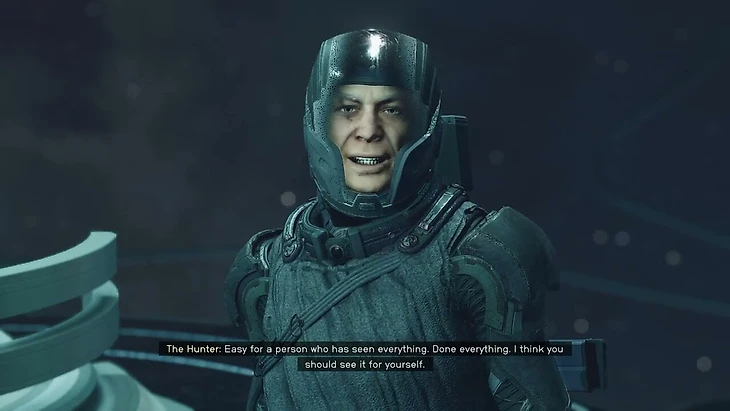 В разговоре Охотник упоминает некое Единство. Общаемся с мудрым хранителем Аквилусом и узнаем о пилигриме, который тоже искал Единство. Идем по его следу и читаем записи о скрытой локации на краю галактики – там корабль Звездорожденных. Пилоты отмечают способности незваного гостя и зовут его на борт.