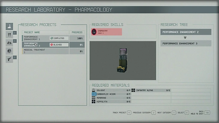Взаимодействуйте с одной из них и проверьте вкладку Фармакологии (Pharmacology) для всех доступных проектов. Здесь игроки могут разблокировать Улучшение Работоспособности (Performance Enhancement) и Медицинское Лечение (Medical Treatment), которые предоставляют доступ к таким предметам как Amps (Усилители) и таким лечебным предметам как Infused Bandages (Инфузионные бинты).