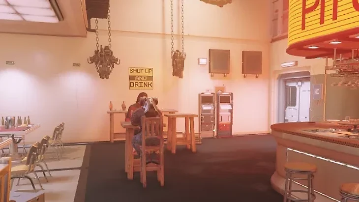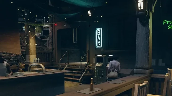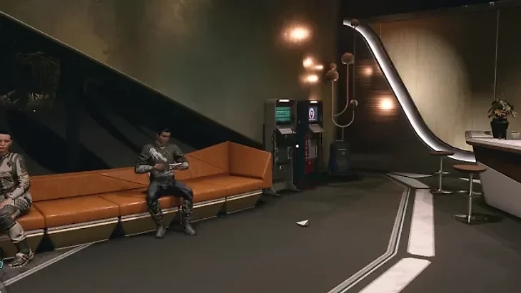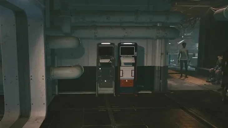 Спуститесь по рампе и пройдите через контрольно-пропускной пункт. Слева вы увидете Viewport Bar. Киоск находится в дальнем углу бара.