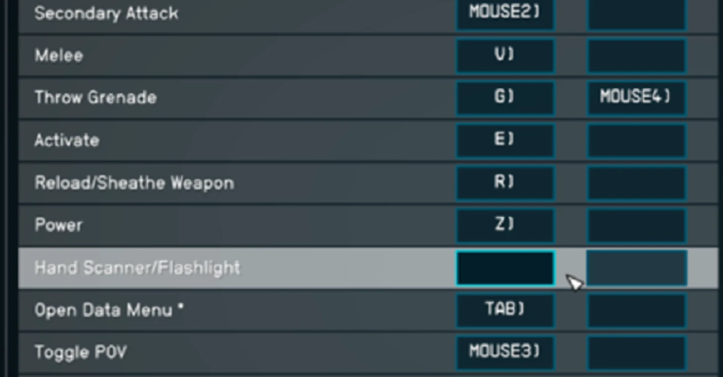 Проверьте привязку клавиш, возможно, настройки были случайно изменены. В меню управления фонарик обозначен как Hand Scanner/Flashlight.