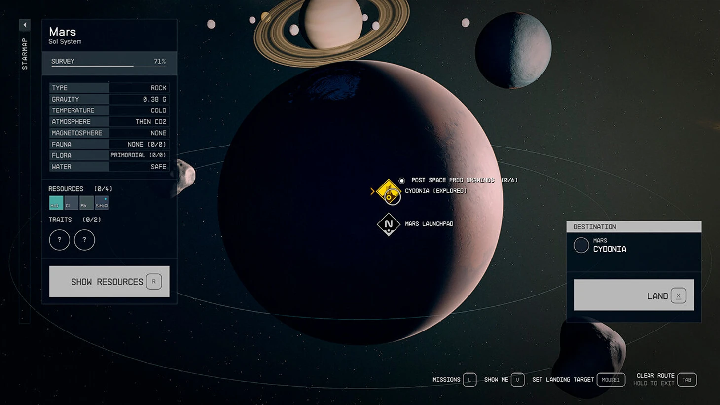 На карте можно просканировать планеты и увидеть, какие ресурсы на них преобладают. Железо отмечено значком химического элемента Fe, а зоны, в которых его много, обозначены темно-красным цветом. Приземлитесь на планету в зону с железом, включите сканер и отправляйтесь с лазерным резаком на фарм.