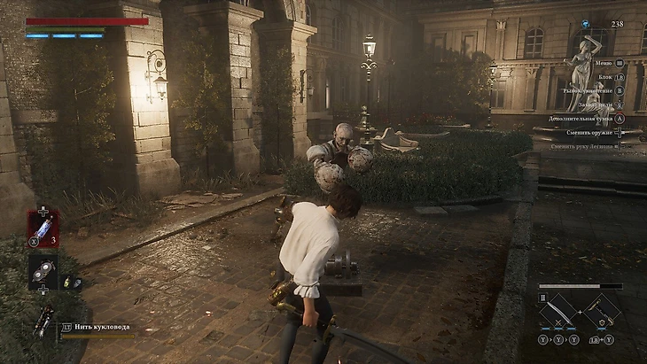 Основы боя в Lies of P – интуитивно понятная штука: бьешь, парируешь, уклоняешься, активируешь спецудары. Но выполнять все идеально непросто. Отточить ключевой навык – парирование – проще всего в бою с манекеном, который не может ответить. Первый манекен встретится рядом с бродячим торговцем у цирка, как раз перед боем с боссом «Командующий парадом».