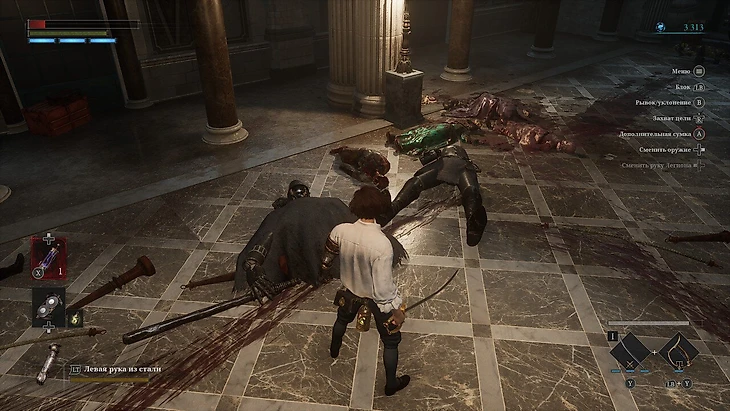 Одним парированием игру не пройти, так что научитесь заодно и уклонениям. Они выполняются на кнопку Пробел / «круг» / B и особенно важны в бою с большими противниками. Первый манекен для тренировки находится в отеле Крата – локации после первого босса. До этого тренируйтесь на обычных противниках, предварительно нажав кнопку фиксирования на цели RS / R3. Бегайте вокруг них и уклоняйтесь, не нанося урона.