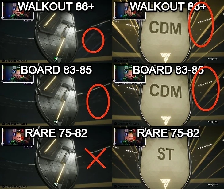 Каждый год волкауты в FIFA Ultimate Team меняются, но FC 24 они максимально простые. Следите за насыщенностью лучей во время представления страны, позиции и клуба. Стандартные эффекты и отсутствие вспышек предсказывают редкие карточки с рейтингом 75-82, приглушенные лучи – 83-85, а яркие эффекты и отчетливые белые полосы указывают на волкаут с рейтингом 86+.