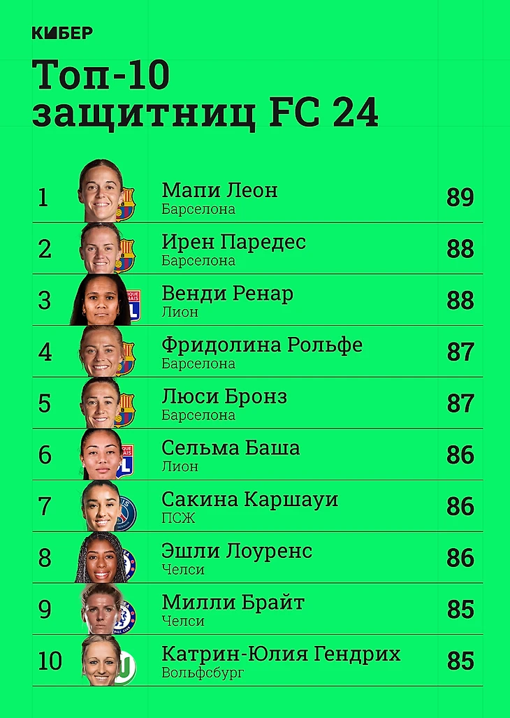 Лучшая защитница FC 24 – Мапи Леон из «Барселоны», а ее одноклубницы Ирен Паредес, Фридолина Рольфе и Люси Бронз заняли топ-5. Рядом футболистки «Лиона» – Венди Ренар и Сельма Баша.