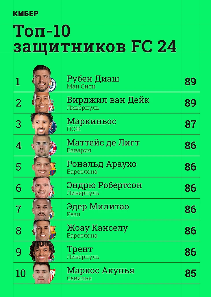 В ФК 24 рейтинги защитников кардинально не меняли, но топ-10 заметно преобразился. На первое место вырвался Рубен Диаш из чемпионского «Ман Сити», а вторым стал Вирджил ван Дейк – центрдефа «Ливерпуля» понизили на один пункт за провальный сезон команды. Тройку уверенно замкнул защитник «ПСЖ» Маркиньос.