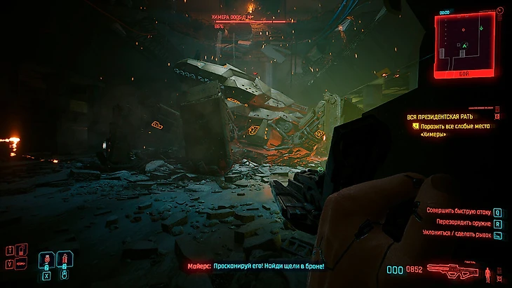 После катсцены начнется бой с «Химерой». По всей площади арены разбросаны боеприпасы и хилки, нужно попасть во все оранжевые места босса, чтобы обезвредить его.
