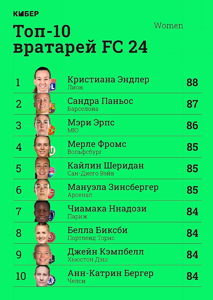 Лучший вратарь женского футбола в FC 24 – Кристиана Эндлер из «Лиона» с ростом 183 см. Второе место заняла Сандра Паньос из «Барсы», а третье – Мэри Эрпс из «Юнайтед». Их рост всего 169 и 173 см, поэтому они вряд ли появится в составах игроков.