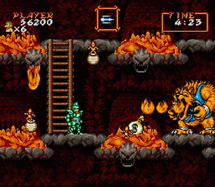 Super Ghouls ‘n Ghosts практически не оставляла игрокам права на ошибку. У местных врагов была молниеносная скорость атаки, пол под ногами персонажа так и норовил провалиться, а еще на экране регулярно появлялись лавины, закрывающие обзор. Будто этого мало, на прохождение каждого уровня давалось строго ограниченное время — из-за спешки мы ошибались еще чаще. Поэтому если, например, для прохождения Dark Souls от игрока требуется простой скилл и усидчивость, то в Super Ghouls ‘n Ghosts нужен как минимум Ультраскилл.