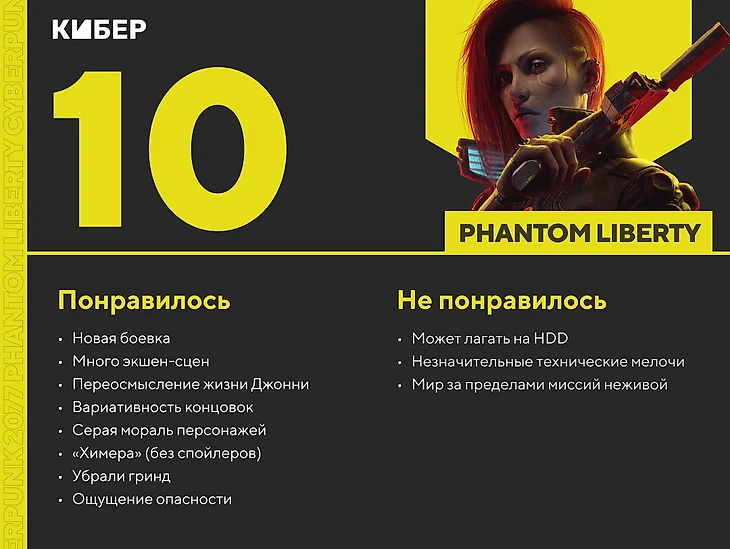 Phantom Liberty – это умело проведенная работа над ошибками и удачная попытка вернуть доверие игроков. CD Projekt RED научилась на ошибках крайне жестким методом, поэтому поместила в дополнение все, что понравилось игрокам в основной игре: сюжет, визуал, сайдквесты, личности персонажей и импланты. Они улучшили то, что раньше не работало так, как должно: битвы с боссами, перки, вождение. Выбросили части игры, от которых было больше всего недовольства: гринд бессмысленных точек интереса, долгие поездки без знаков быстрого перемещения, ИИ полиции. И это сработало!