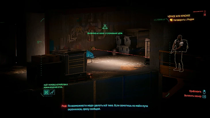 Просканируйте все вокруг через меню сканера. Первым делом надо найти Рида – он находится справа. Сообщайте ему о стоящих на пути охранниках, камерах, главном лифте и минах. Держите сканер постоянно включенным, чтобы видеть все препятствия на пути. Снайперка подключится не сразу, так должно быть, просто ждите и рассматривайте всех врагов на этаже и снайпера на крыше.