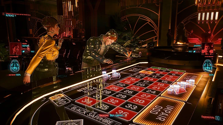 Заберите чип из бокала и идите с Ридом к покерному столу, где сидят нетраннеры-близнецы. Возьмите фишки и поставьте их. Вероятно, рулетка настоящая, и для нее нет единственно верной комбинации, поэтому удачи. В диалоге с близнецами не раскрывайте себя, но их можно бесить провокационными вариантами ответа – брат будет остро реагировать, а сестре понравится грубость главного героя.