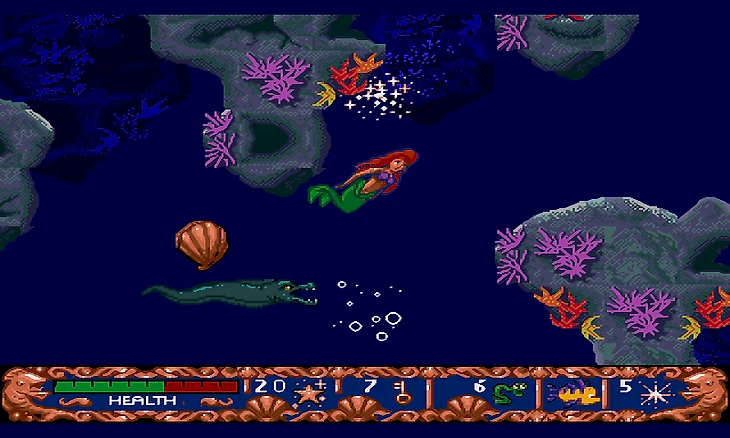 Ariel – The Little Mermaid. Довольно-таки сложная, но короткая игра (всего-то 4 уровня). Можно управлять как Ариэль, так и ее отцом Тритоном. На помощь по ходу действия приходят верные друзья, сражаться же надо с разными обитателями подводного мира.