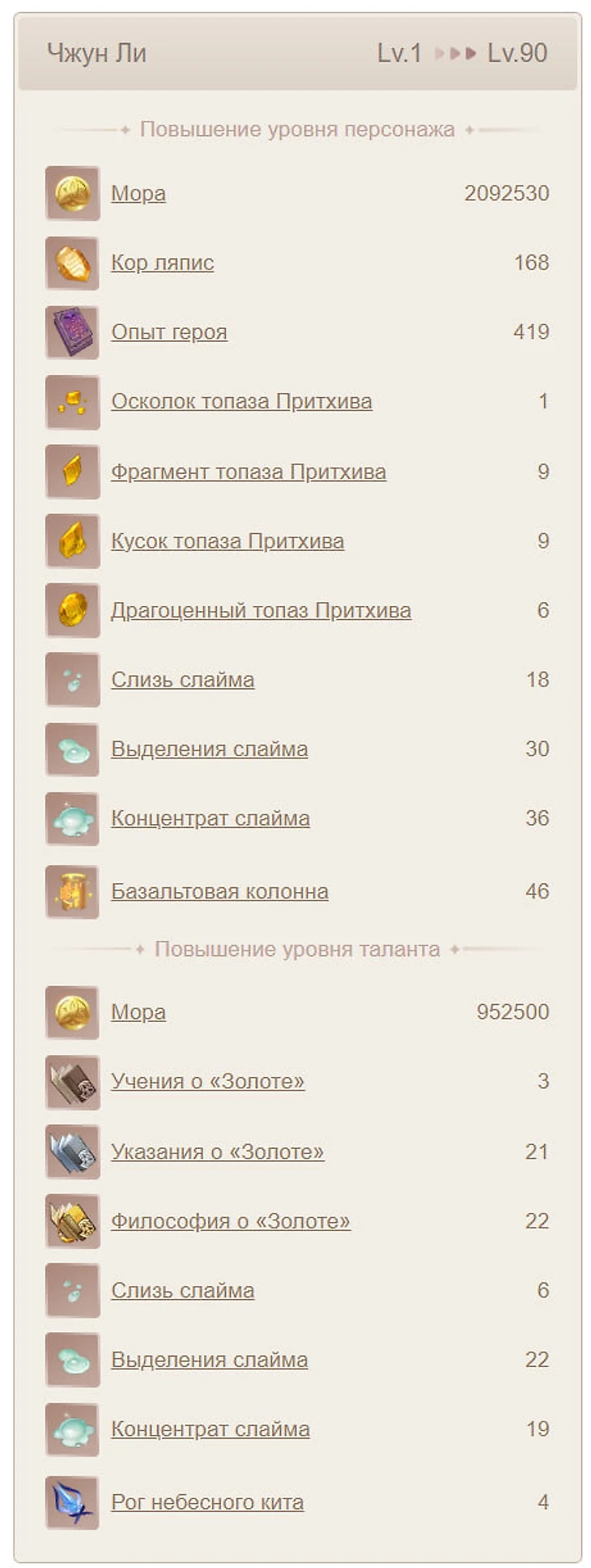 Для прокачки Чжун Ли понадобятся топазы Притхива, базальтовые колонны, кор ляпис, слизь слайма/выделения слайма/концентрат слайма, а для его талантов нужны учения/указания/философия о «Золоте» (ср, сб, вс «Тайшаньфу») и рога небесного кита.