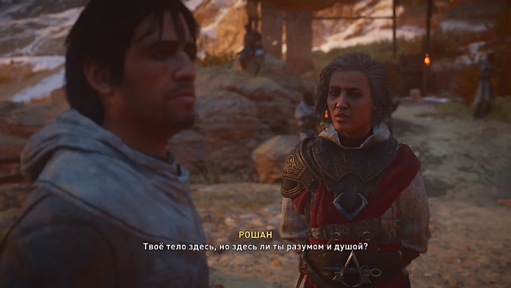 В финале миссии состоится тренировочный бой с Рошан, где обучат стандартным ударам, усиленным выпадам и парированию. После тренировки сходите на вылазку с Нуром: там поднимитесь на смотровую площадку, скатитесь по тросу в каньон и тихо убейте наемников. Осмотрите их мечи, и миссия закончится.