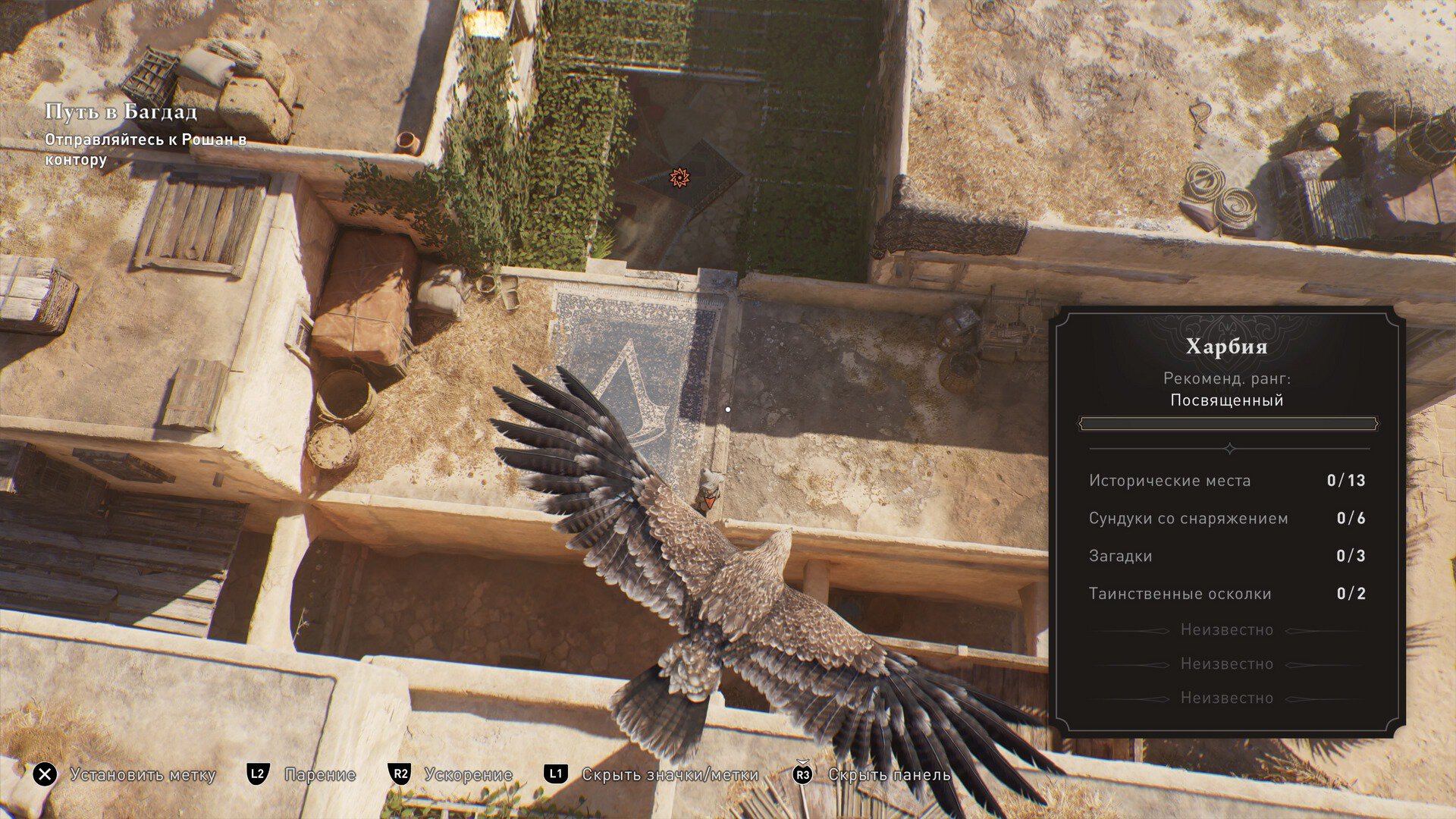 Как и в прошлых играх серии, птица помогает с высоты изучить местность, увидеть врагов, найти сундуки и прочие секреты. Нас интересует большой синий ковер с логотипом Assassin’s Creed. Если вы задержите золотой круг исследования на нем, то прозвучит сигнал. Поздравляем, вы нашли вход в контору Незримых.