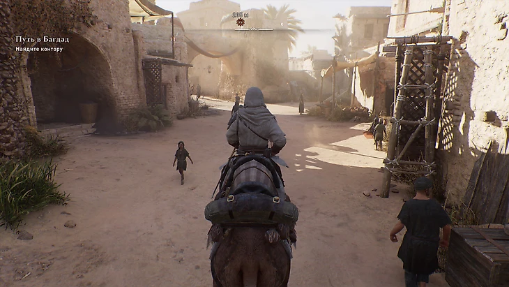 Басим въезжает в город на верблюде. При желании можно продолжить путь верхом прямо до маркера – иконки остроконечной звезды желтого цвета с вопросом внутри.